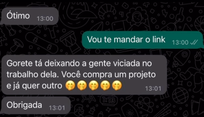 "A Gorete tá deixando a gente viciada no trabalho dela. Você compra um projeto e já quer outro.